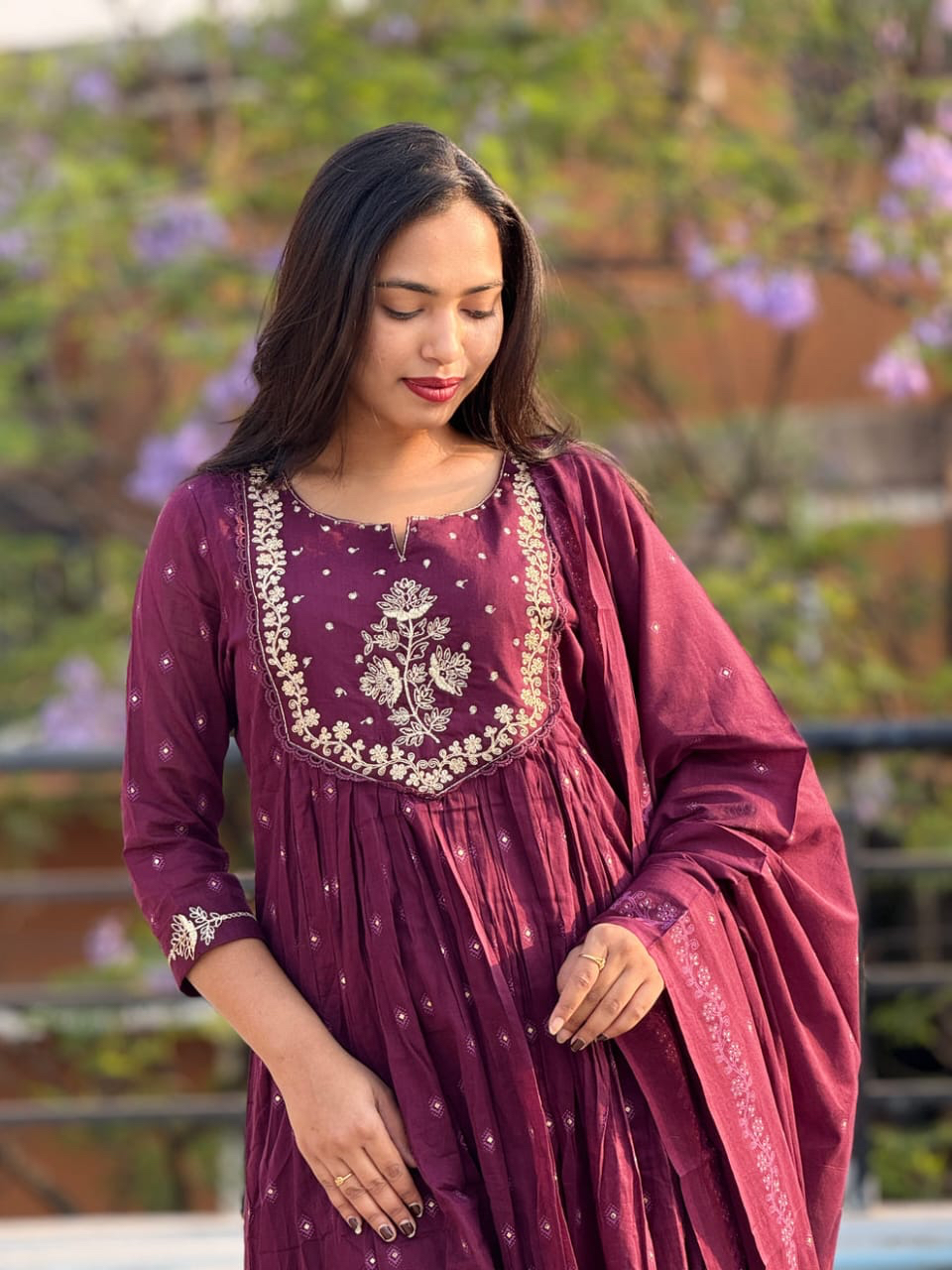 this deep maroon Anarkali suit set, designed for festive elegance and timeless charm. The suit features intricate cream embroidery on the neckline and sleeves, paired with a matching embroidered dupatta for a complete ethnic look.