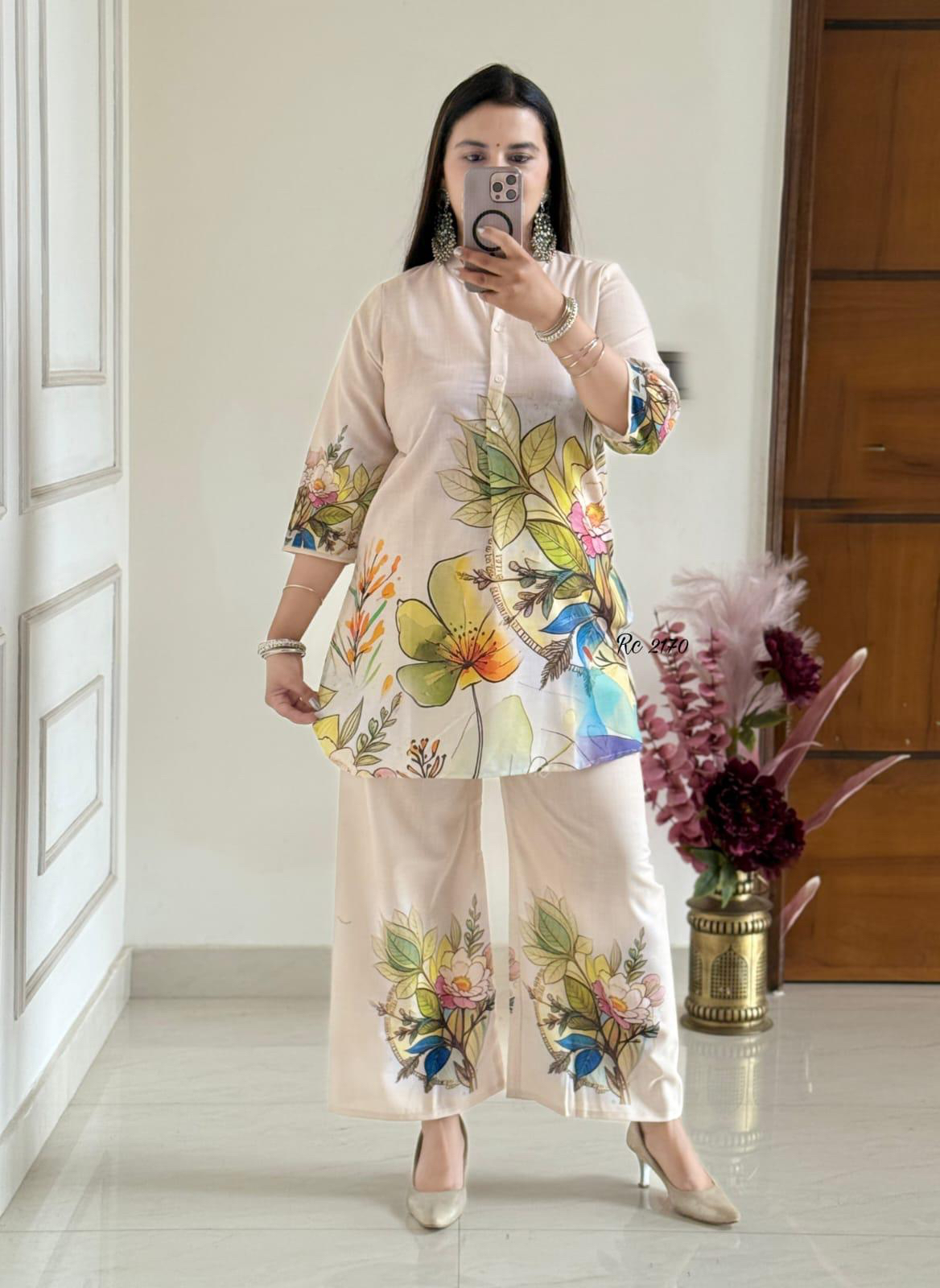 “Women’s floral printed co-ord set with pastel kurta and wide-leg pants featuring vibrant nature-inspired