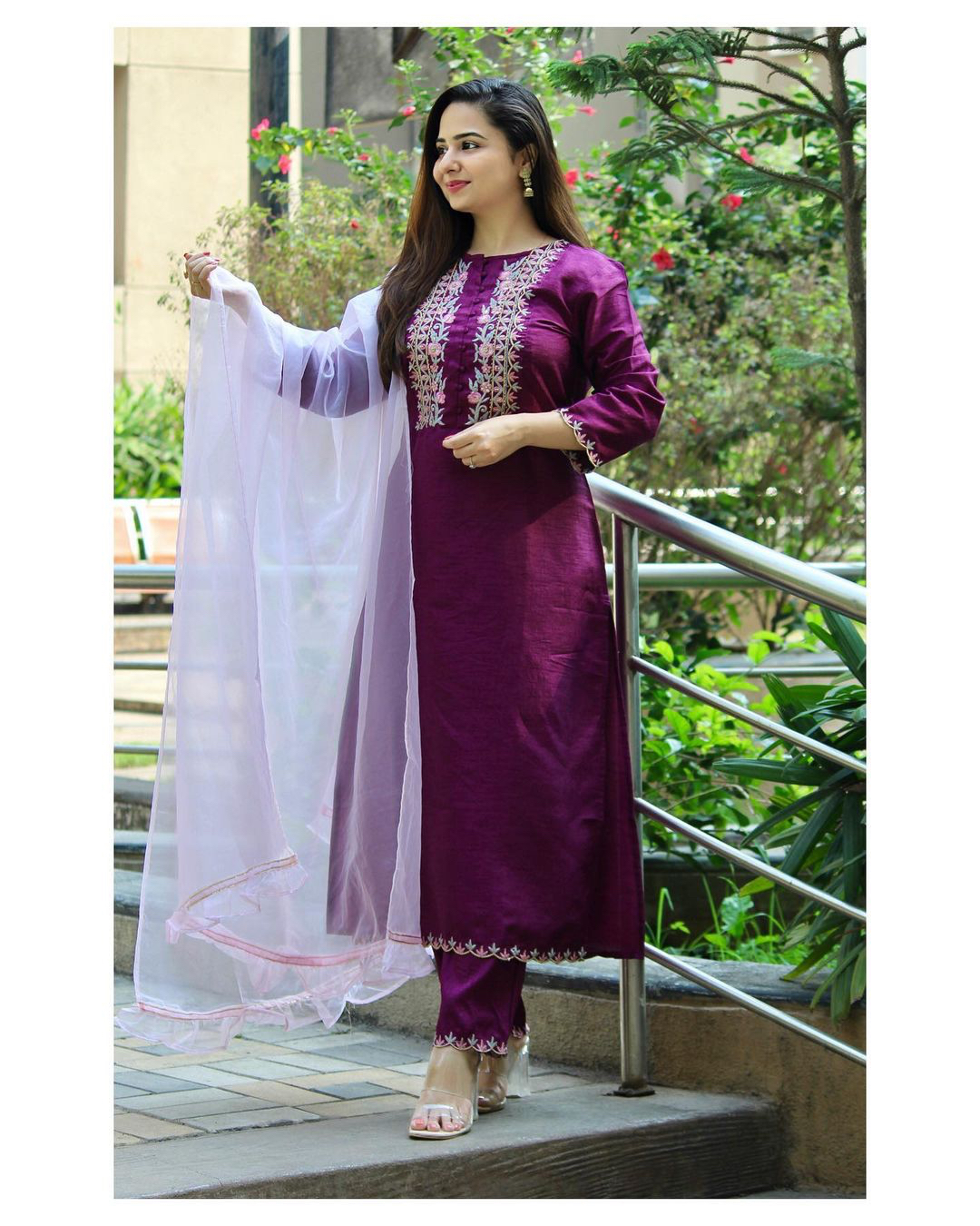 maroon silk kurta set, embroidered kurta for women, organza dupatta suit, ethnic wear set, festival kurti set, wedding kurta set for women, designer kurta with pants, traditional Indian outfit, stylish kurti for women