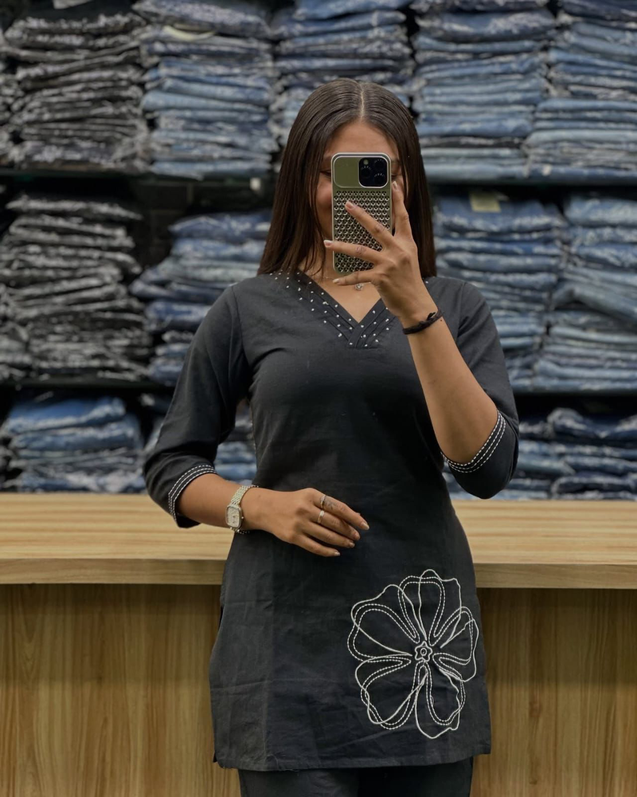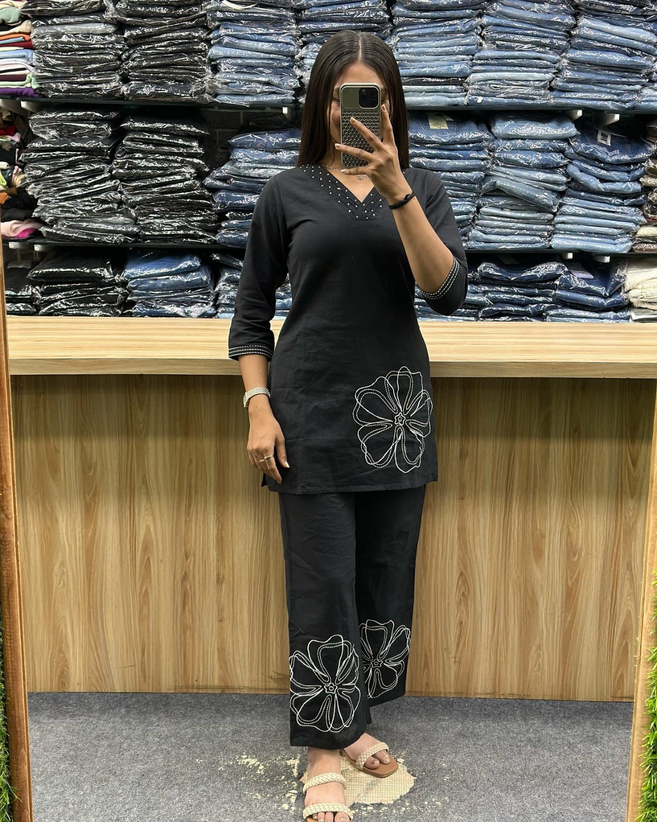 The intricate thread work is the highlight of this ensemble. It adds a refined, handcrafted touch to your overall look. This two-piece set blends traditional artistry with modern fashion. It includes a stylish top and perfectly matching bottoms. Ideal for casual outings, brunch dates, or festive gatherings, this outfit ensures you look polished and put together.