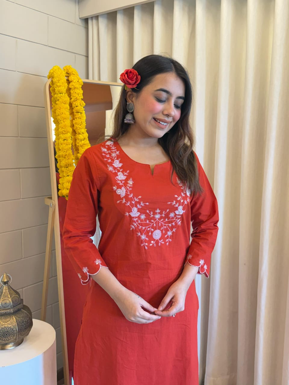 Woman wearing a rust red straight kurta set with white floral embroidery, festive indoor setting with marigold flowers.
